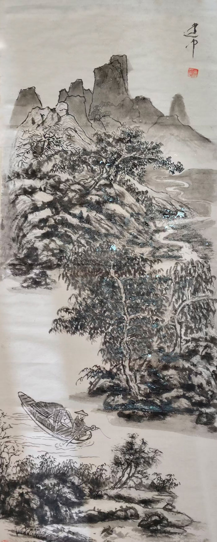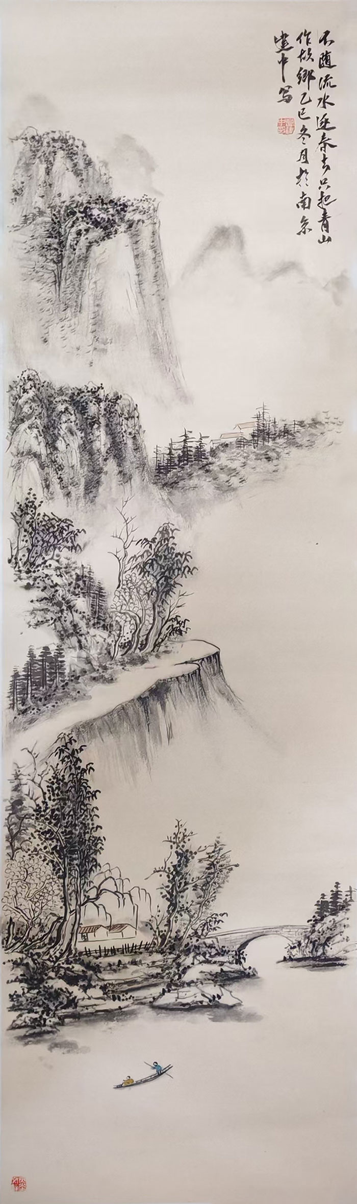 此外,葛建中擅长以简练的笔触捕捉自然的神韵。例如,在《一叶小舟向东流》中,他以寥寥数笔勾勒出江水的流动感,通过墨色的浓淡变化表现光影的虚实,使画面充满动态美与诗意。这种“以少胜多”的技法,彰显了其深厚的笔墨功底与艺术造诣。