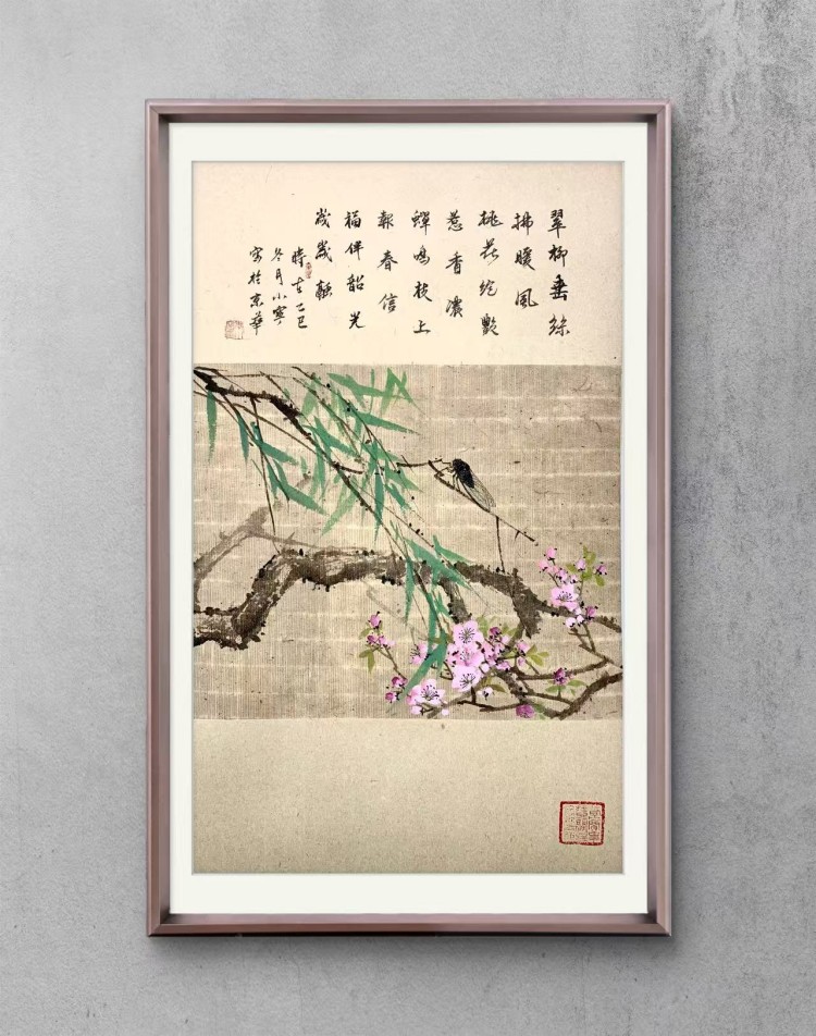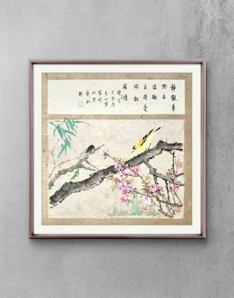 在她的笔下,牡丹清新雅致,褪去俗艳,自具风骨;花卉与草虫并非孤立静物,而是融入自然的呼吸与天地的韵律之中。螳螂振翅欲动,蝉翼通透如纱,每一处细节皆凝聚着蓬勃的生命力与精妙的自然法则。她的作品,宛如撷取田园诗篇中的灵动一瞬,既有科学观察的严谨,亦富哲学思考的深远,最终凝练为一种宁静隽永、生机盎然的个人艺术风格。